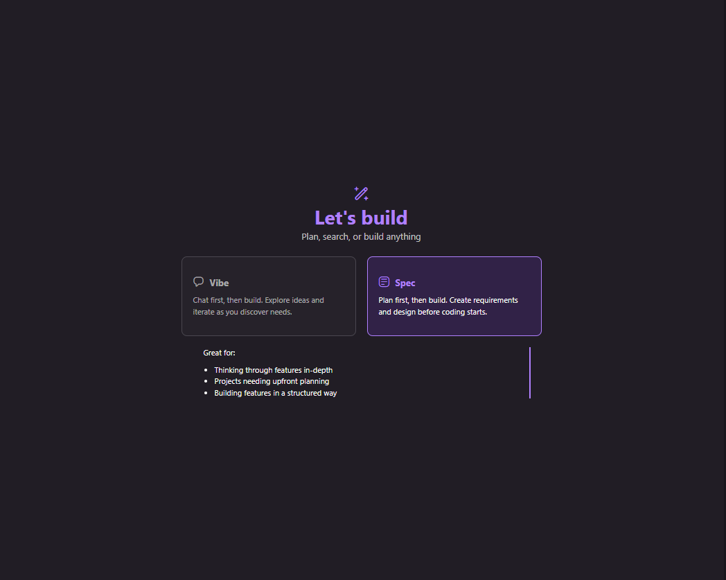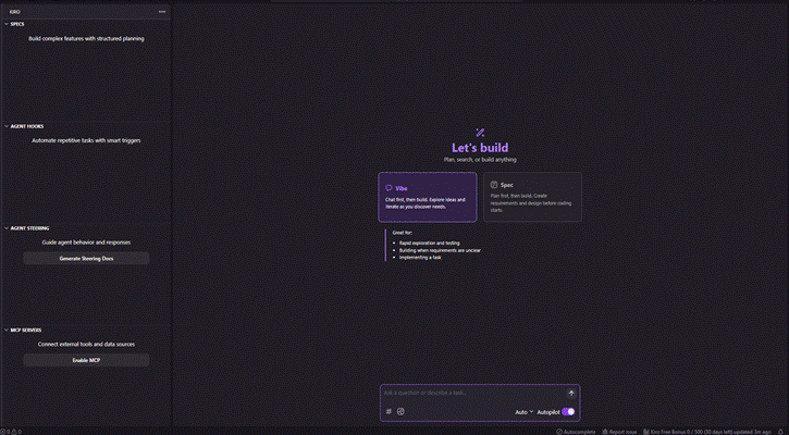 まずはVibeモードです。kiroを立ち上げるとこんな画面がでてきます。