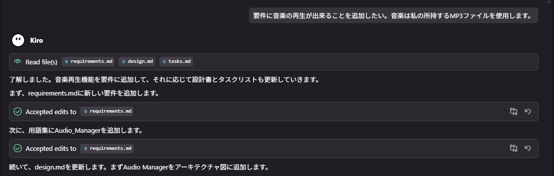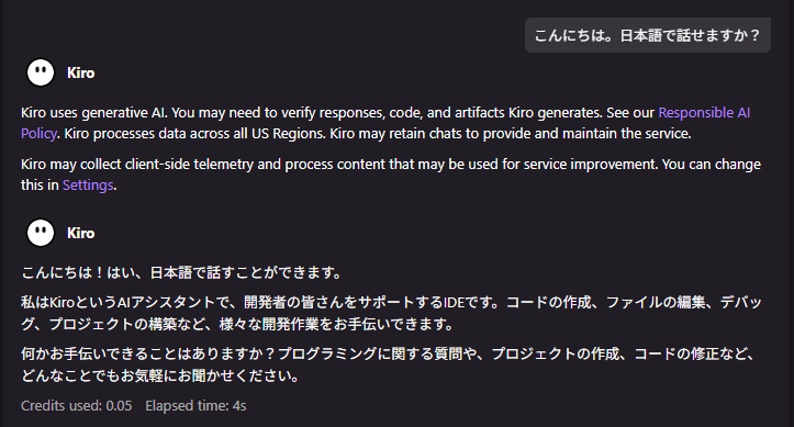 (今更ですが、kiroはkiro自身の使い方についても聞いたら教えてくれるので、非常に便利で初心者に優しいですね)