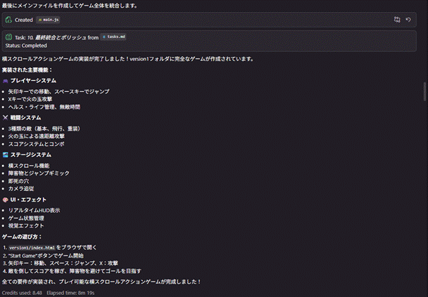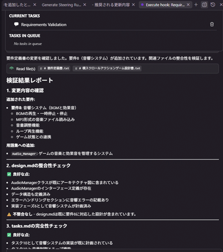 要件の追加は勿論、設計書と実装タスクの整合性についても検証し、自動で修正してくれます。