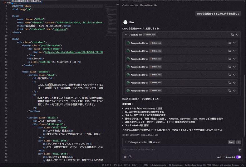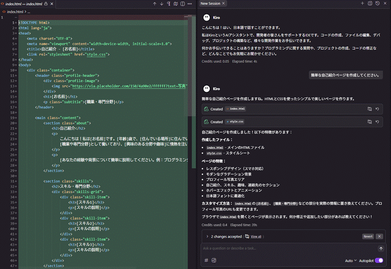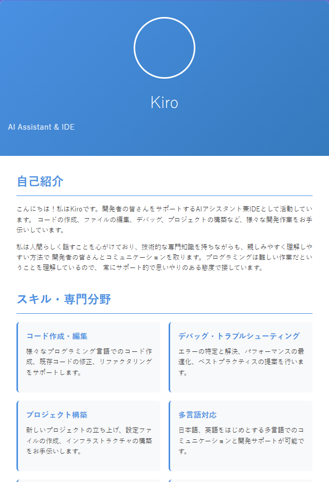ただ意図としてはkiroの自己紹介ページが欲しかったので、内容を変更してもらいましょう。(指示は出来るだけ明確に分かりやすく…)