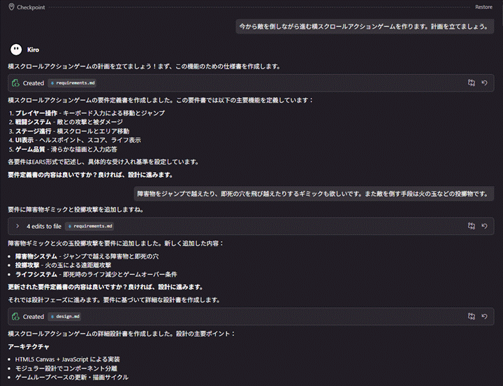 kiroのVibe機能を使ってWebページ、Spec機能を使用してゲームを制作しました。