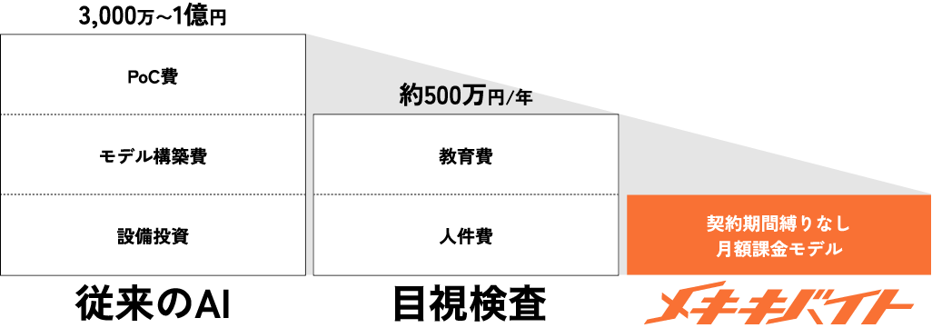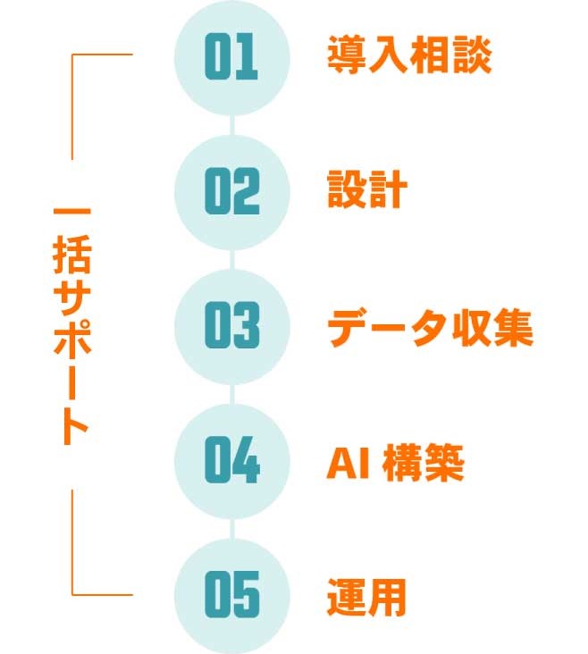 月額制で、初期投資リスクを最小化し、スモールスタートを実現。 導入初期から運用フェーズまで、データ収集、アノテーション、AI構築、運用支援を一気通貫で伴走します。